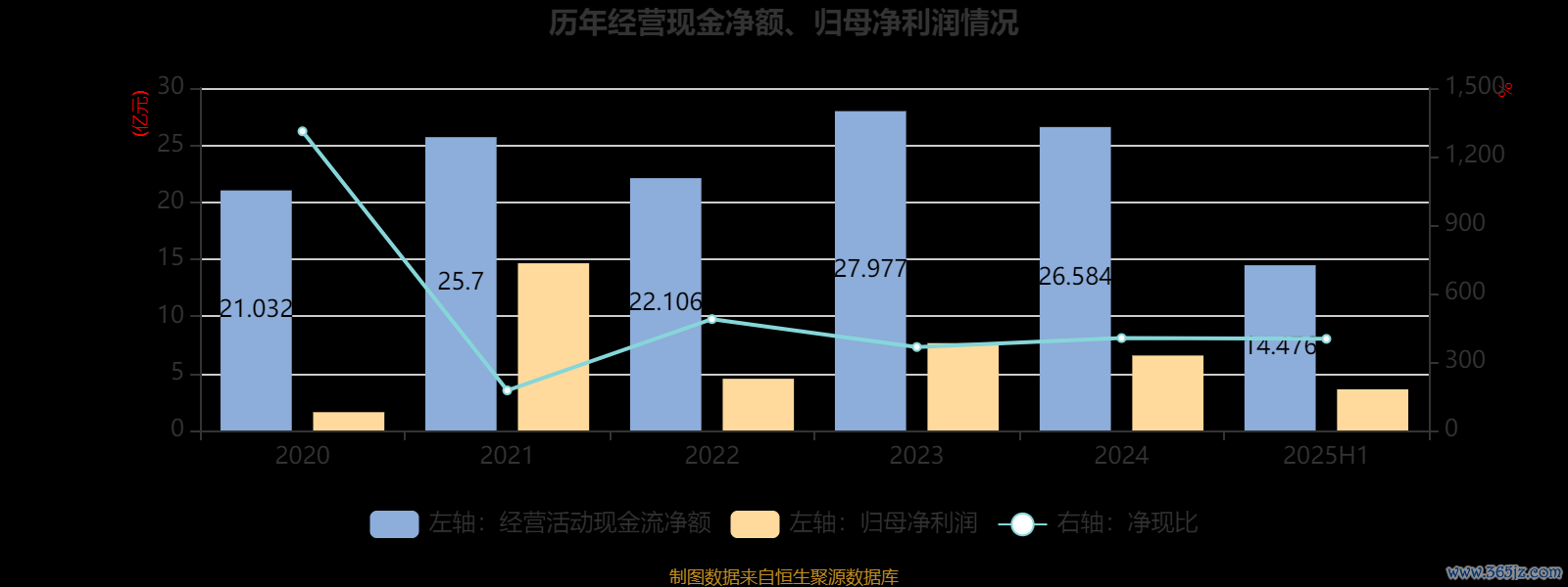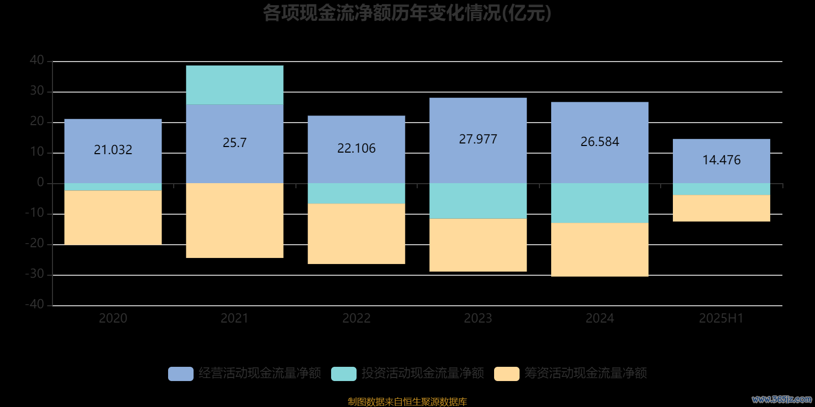 2025年上半年,公司经营活动现金流净额为14.48亿元;筹资活动现金流净额-8.72亿元;投资活动现金流净额-3.85亿元。